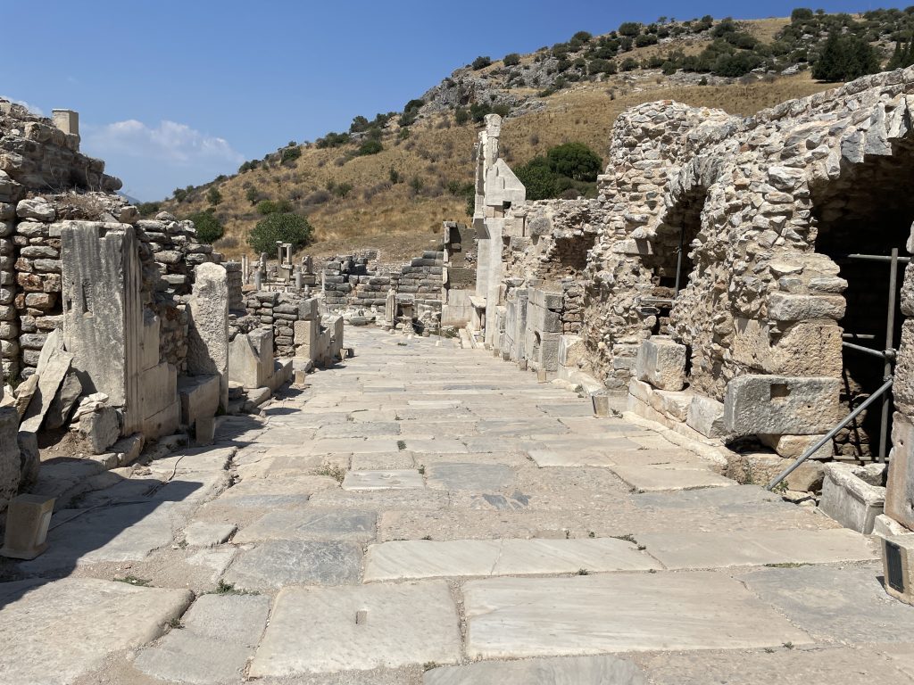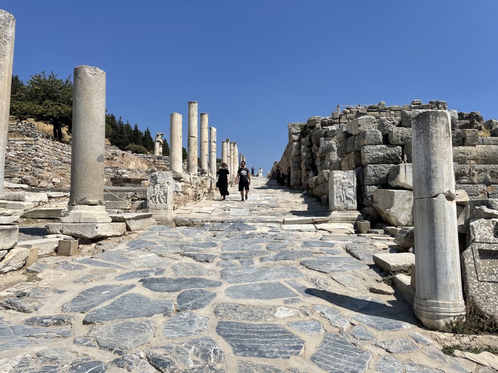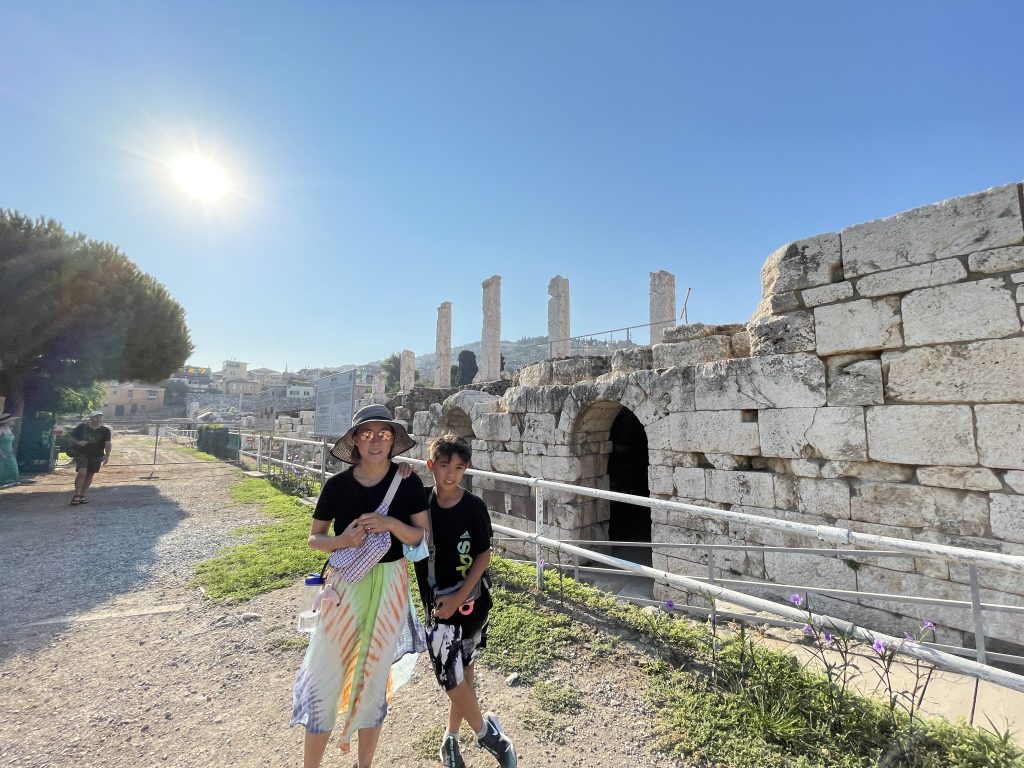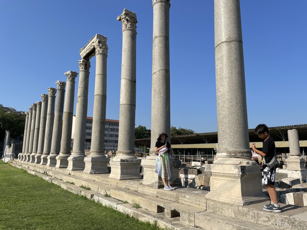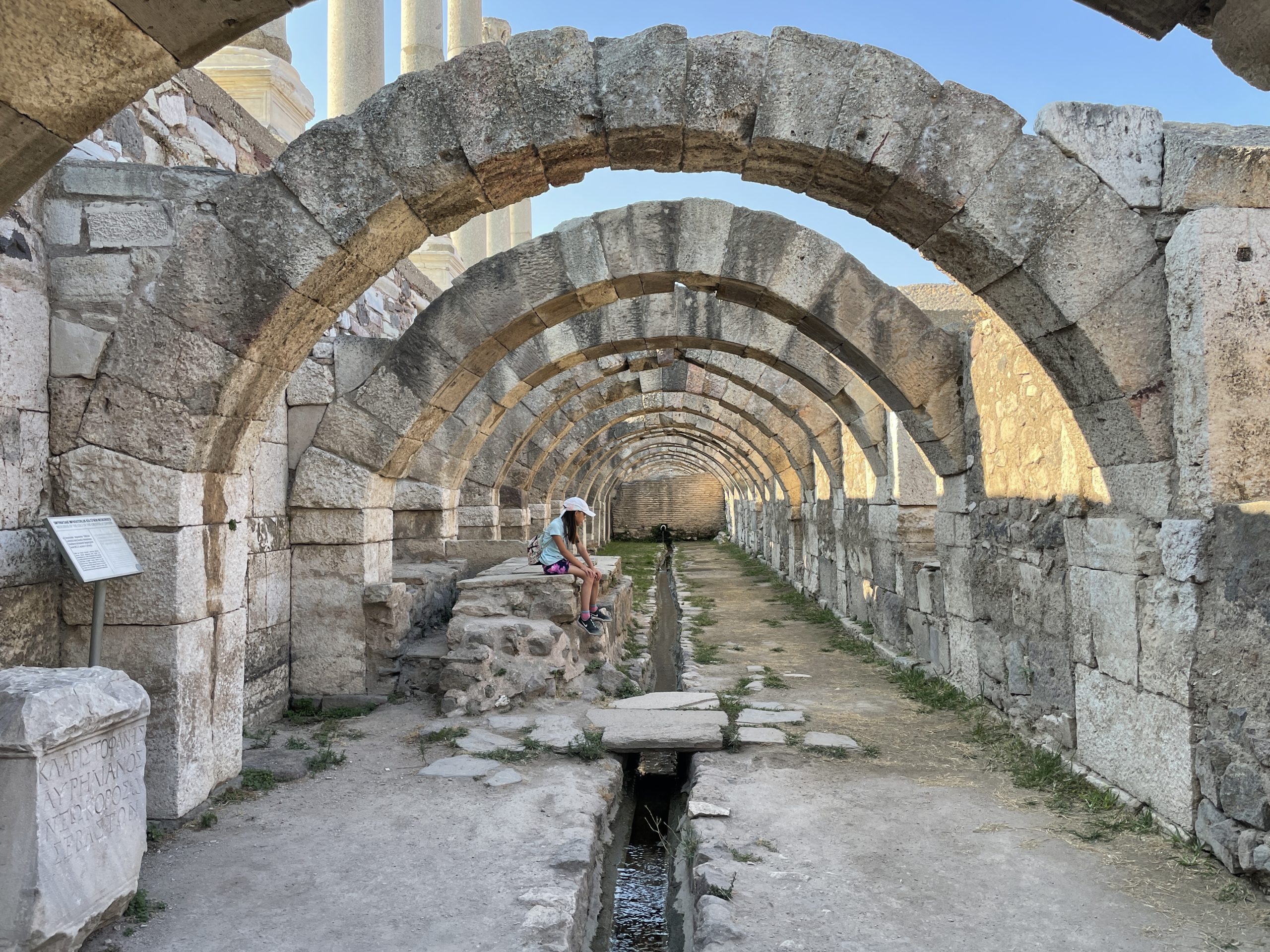 We visited the ancient Agora of Smyrna, which is the location of one of the seven churches of RevelationCarina on the lower level of the ancient Agora, which was built during the Roman times. They built an upper and a lower level, similar to how we build a multi-story shopping mall nowadays. The lower level would be cooler in the middle of a hot day. It is filled with shops, and in the middle is a water channel.The pillars of the building, likely a basilica, on the upper level of the Agora
