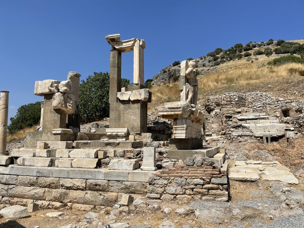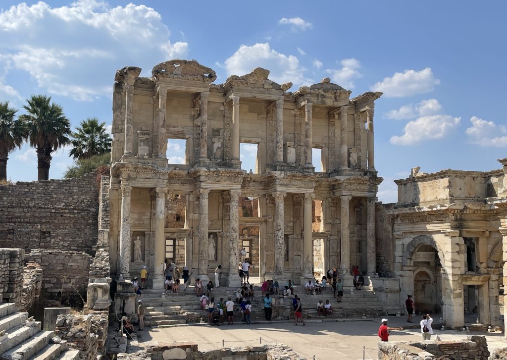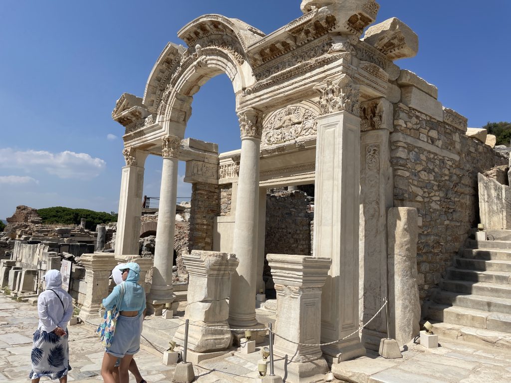 The Roman streets and shops are still visible as you walk in this sprawling ancient cityOne can easily spend half a day in ancient Ephesus. It was pretty hot (34C) when we visited. It would have been a lot enjoyable if we come during a cooler month.St Paul stayed in Ephesus for more than two years and brought many people to Christ. When many abandoned their idols, it meant declining business for the local idol makers. Some fellows started a riot at the sight of Paul, and as a result he was removed from the city by the Roman soldiers.The front of an ancient building with beautiful relief on the archThe floor mosaic and wall decoration inside a private homeThe Library of Celsus