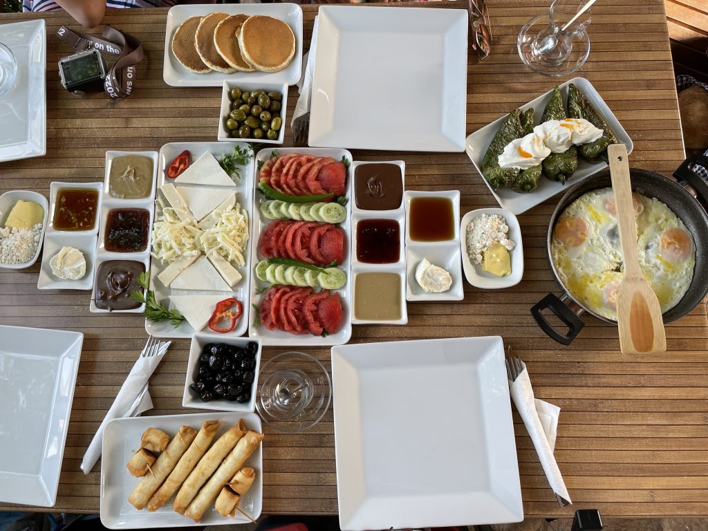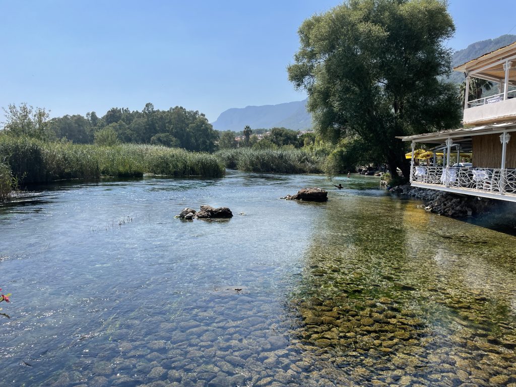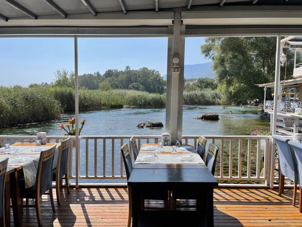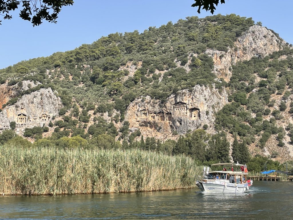Turkish breakfast by the river in DalyanA small boat sailing in front of the Tombs of the Kings, believed to be tombs carved by the Lycians to honor their kings and the royal families. There are about 200 of such rock-carved tombs in this part of Turkey.