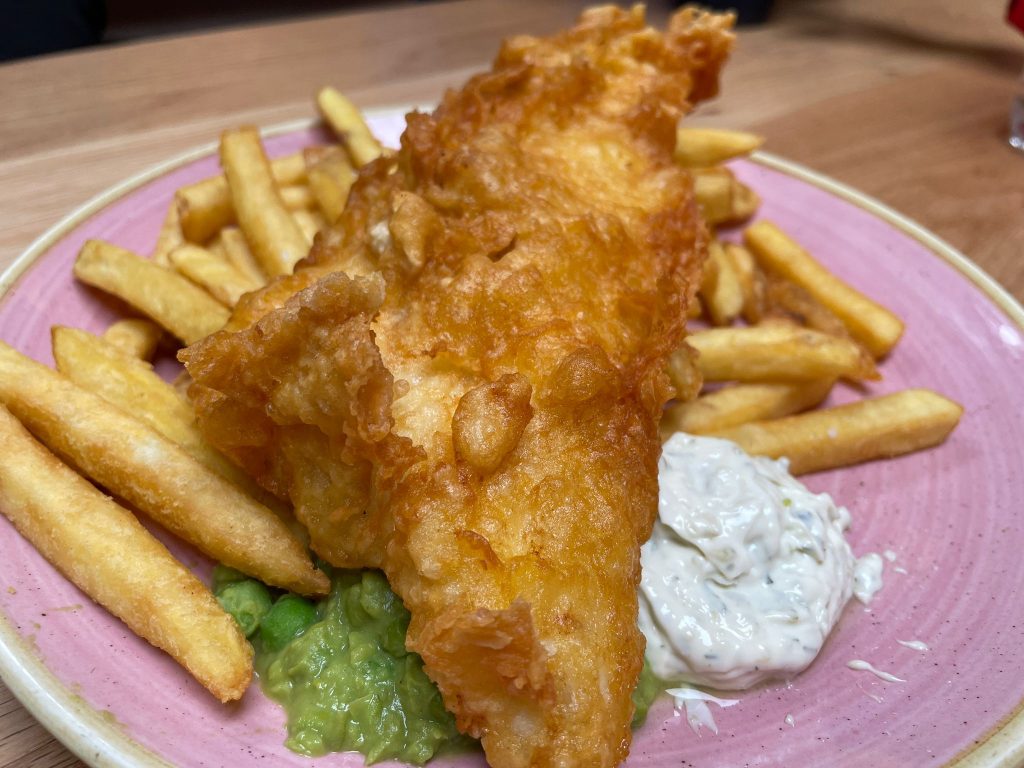 We enjoyed our first ‘fish and chips’ in the UK. The fish fillet is tender and juicy, while the beer batter is light and crunchy. It is served with potato chips, tartar sauce, and meshed green peas.